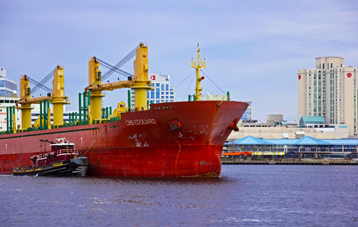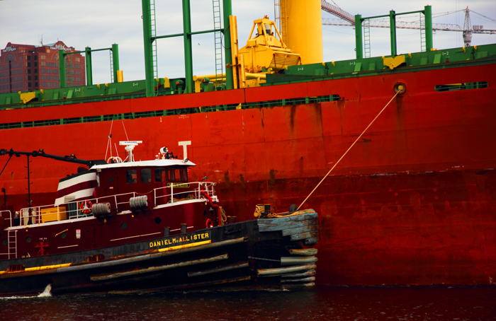 The Elizabeth River is a busy, urban, working river. Standing at Waterside (in the background with blue roof), one can watch an array of ships, including freighters, war ships, working tugs and an occasional tall ship flying a foreign flag. Home to one of the busiest harbors on the East coast and the largest naval base in the world, Norfolk, Virginia is proud of its nautical history.