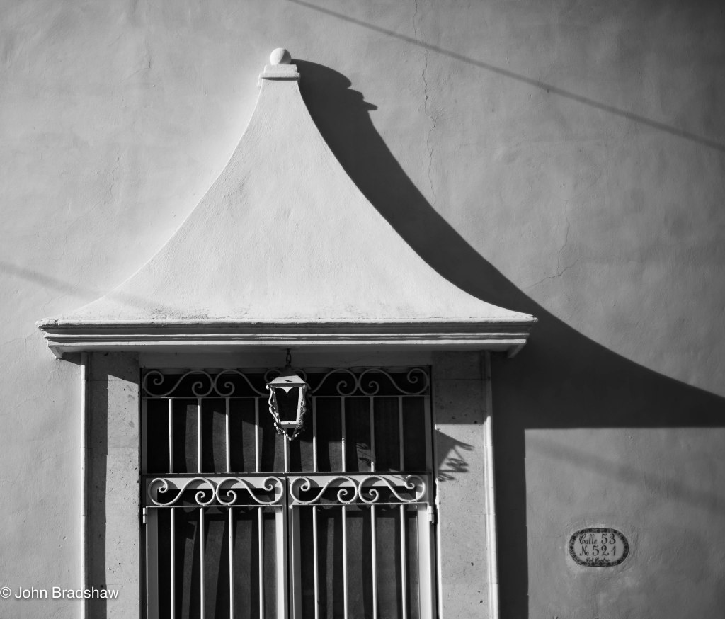 A bit dirty, but facade of one of two twin mansions on Paseo Montejo, Mérida, Yucatán. Shot with Canon EOS-1 and Ilford HP+ black and white film.